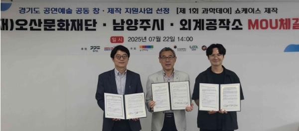 [한국뉴스타임=편집국] 남양주시는 지난 22일 ‘2025년 경기도 공연예술 공동 창·제작 지원사업’의 일환으로, 오산문화재단 및 예술단체 외계공작소와 함께 연극 ‘제1회 과학데이’ 공동제작 협약을 체결했다고 24일 밝혔다.