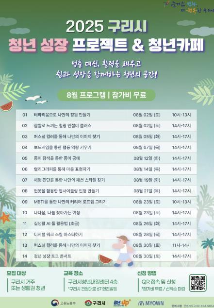 구리시의 ‘청년 성장 프로젝트’는 청년들이 자신을 돌아보고, 미래를 설계할 수 있도록 돕기 위해 마련된 프로그램으로 지금까지 청년들의 자기 이해, 진로 탐색, 일상 회복 등을 주제로 매월 다양한 프로그램을 운영해 왔다. 8월에는 ‘멈춤 대신 활력을 채우고, 쉬며 성장하는 청년의 공간’을 콘셉트로 총 14개 프로그램을 운영할 예정이다.