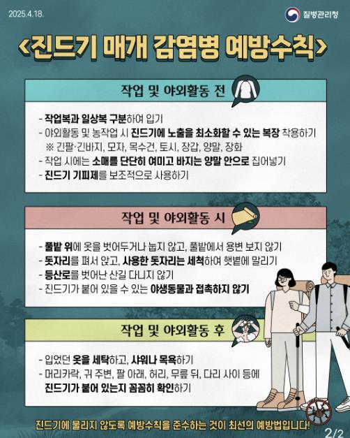 아울러 야외활동 후에는 바로 옷을 세탁하고, 목욕을 하면서 머리, 귀 주변, 팔, 다리, 허리, 무릎 뒤쪽 등 진드기가 붙어 있는지 꼼꼼히 확인해야 한다.