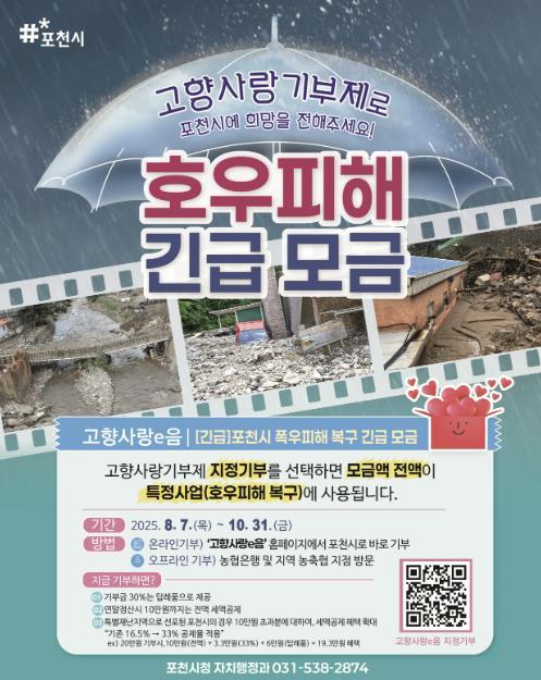 기부는 ‘고향사랑e음 누리집’ 또는 전국 농협 창구에서 가능하며, 모금액 전액은 포천시의 호우 피해 복구 사업에 사용할 계획이다.
