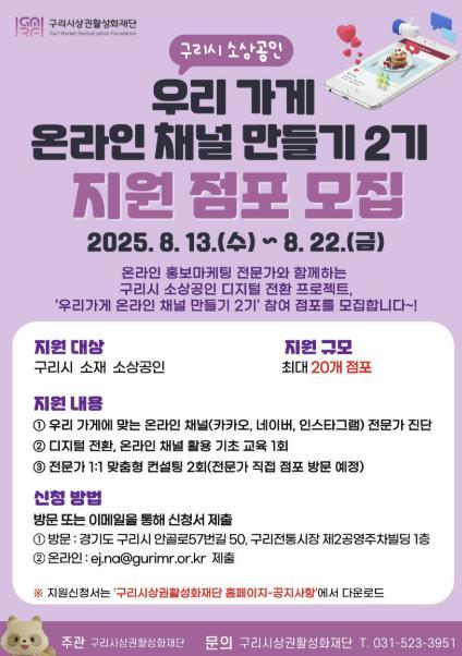 [한국뉴스타임=편집국] 구리시상권활성화재단은 오는 8월 13일부터 8월 22일까지 ‘우리 가게 온라인 채널 만들기’ 2기 참여 점포를 모집한다.