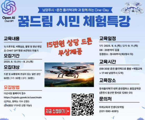 주요 프로그램은 한국폴리텍대학 꿈드림 공작소의 지원으로 운영되며 △드론 안전교육 및 조립 △중급비행 △챗GPT의 이해 및 활용 등으로 편성됐다. 참가자들은 이를 통해 디지털 리터러시를 높이고, 미래 직업 변화에 대한 대응 능력을 기를 수 있다.