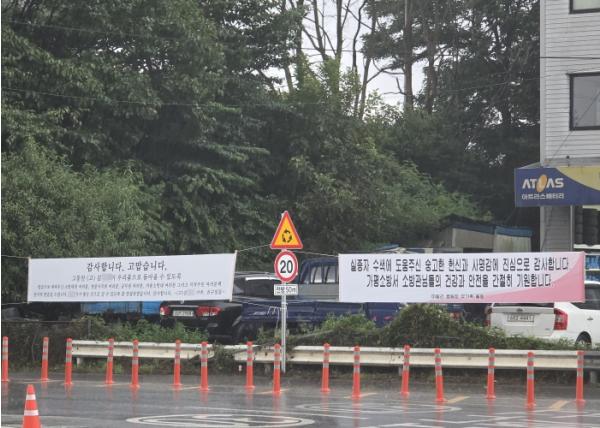 [한국뉴스타임=편집국] 지난 7월20일 집중호우로 발생한 매몰 및 실종사고와 관련하여 실종자 가족들이 가평소방서 앞에 감사의 마음을 담은 현수막을 게시해 주위를 훈훈하게 하고 있다.
