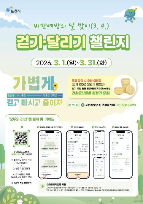 챌린지는 3월 1일부터 31일까지 운영되며, 포천시민 누구나 모바일 앱 ‘모두의 러너’를 통해 참여할 수 있다. 참여자는 걷기 또는 달리기 중 하나를 선택해 걷기 12만 보 또는 달리기 30km 달성을 목표로 도전하게 된다. 목표 달성자 중 추첨을 통해 텀블러를 제공할 예정이다.