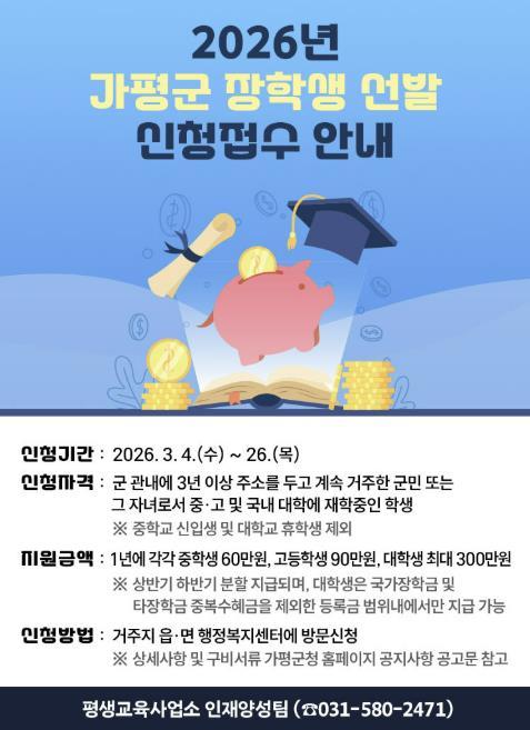 [한국뉴스타임=편집국] 가평군이 지역 학생들의 균등한 교육 기회를 보장하고 우수 인재를 육성하기 위해 2026년도 장학생 선발에 나선다.