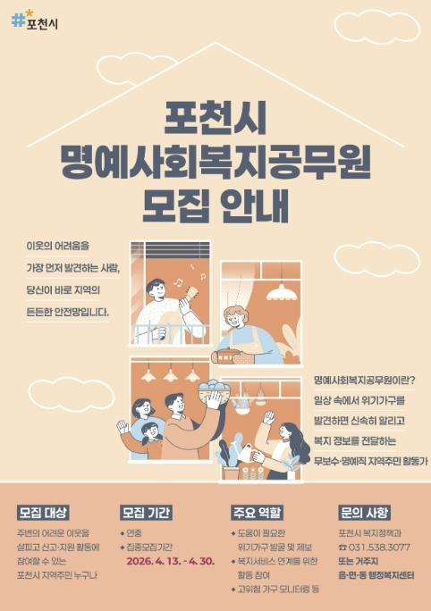 [한국뉴스타임=편집국] 포천시는 복지사각지대 해소와 위기이웃 발굴을 위해 ‘명예사회복지공무원’을 오는 30일까지 집중 모집한다.
