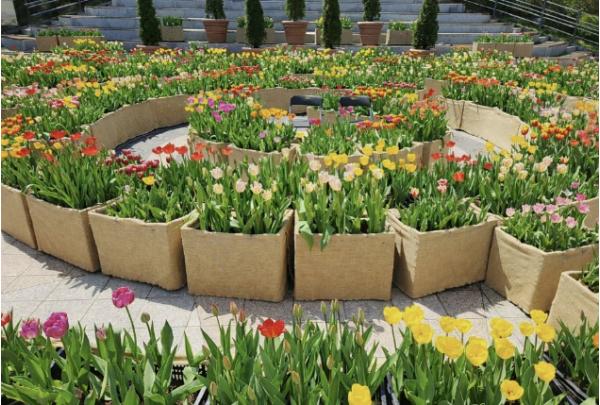 이번 화단은 튤립 구근을 상자 식재 방식으로 심은 튤립상자를 활용해 원형 동선을 따라 미로처럼 걸을 수 있도록 조성한 것이 특징이다. 방문객들은 미로 길을 따라 이동하며 꽃을 가까이에서 감상할 수 있고, 여러 색의 튤립이 어우러진 화단에서 한층 화려하고 풍성한 봄 풍경을 즐길 수 있다.
