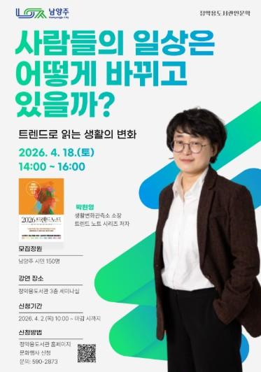[한국뉴스타임=편집국] 남양주시는 오는 18일 오후 2시 정약용도서관 3층 세미나실에서 시민 150명을 대상으로 ‘사람들의 일상은 어떻게 바뀌고 있을까’를 주제로 인문학 강연을 개최한다.