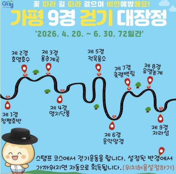 이번 대장정은 이달 20일부터 6월 30일까지 72일간 이어진다. 참가자들은 일상 속 걷기와 함께 가평의 명소인 ‘가평 9경’을 방문해 스탬프를 획득하게 된다. 다만, 제3경인 용추계곡은 사정상 이번 코스에서 제외된다.