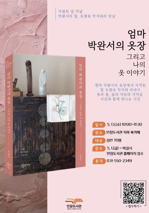 [한국뉴스타임=편집국] 구리시립도서관은 '호원숙 작가와의 만남 ‘엄마 박완서의 옷장, 그리고 나의 이야기’' 참여 신청을 오는 5월 1일부터 접수한다고 밝혔다.