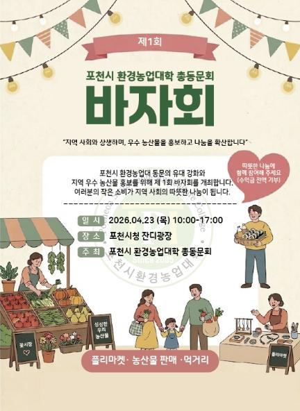 이번 바자회는 단순한 판매 행사를 넘어, 포천 농업을 이끌어가는 환경농업대학 졸업생들의 자긍심을 높이고 시민들과 직접 소통하는 축제의 장이 될 전망이다. 주요 프로그램으로는 △동문 생산 우수 농산물 직거래 장터 △다양한 품목의 프리마켓 △동문 간 결속력을 다지는 교류의 시간 등이 마련된다.