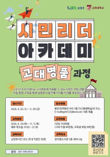 시민리더 아카데미는 고려대학교 미래교육원과 협력해 시민의 자치 역량과 공동체 의식을 높이고 지역사회 참여를 이끌 인재를 양성하는 평생학습 프로그램이다.