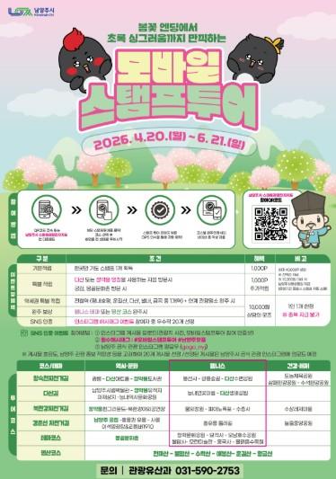 [한국뉴스타임=편집국] 남양주시는 역사·힐링·건강·체험을 결합한 ‘2026년 상반기 모바일 스탬프투어’를 오는 6월 21일까지 운영한다고 23일 밝혔다.