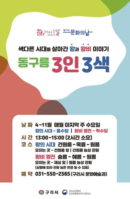 구리시 관계자는 “문화가 있는 날을 맞아 세계유산 동구릉에서 조선의 다양한 시대와 왕·왕비의 이야기를 만나는 뜻깊은 시간이 되길 바란다”라며 “앞으로도 시민들이 역사와 문화를 가까이에서 체험할 수 있는 프로그램을 지속적으로 확대해 나가겠다”라고 밝혔다.