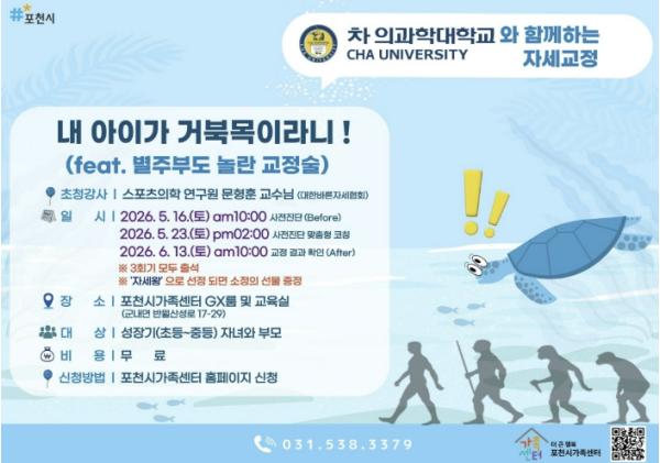 최선희 포천시가족센터장은 “이번 프로그램은 부모와 자녀가 함께 자녀의 자세 상태를 이해하고, 가정에서 건강한 생활습관을 실천하는 데 의미가 있다”며 “앞으로도 지역 대학과 협력해 전문성을 갖춘 가족 중심 건강지원 프로그램을 확대해 나가겠다”고 말했다.