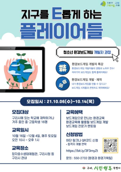 모집 기간은 10월 6일부터 14일까지이고, 환경과 보드게임에 대해 알고 싶은 구리시 소재 학교에 재학하거나 거주 중인 중·고등학생 16명을 선착순으로 모집한다. 교육은 10월 16일부터 12월 11일까지 매주 토요일 진행될 예정이다.