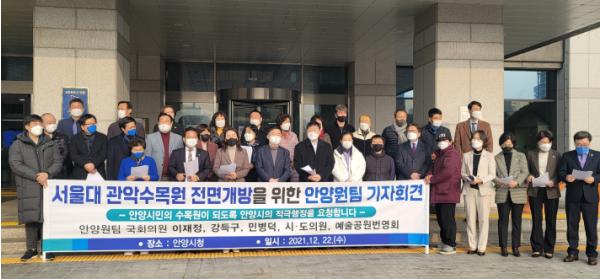 [한국뉴스타임=편집국] 더불어민주당 안양원팀 이재정, 강득구, 민병덕 국회의원을 비롯하여 안양시 민주당 시도의원과 예술공원 번영회는 21일 안양시청에서 “서울대 관악수목원 전면개방을 위한 기자회견”을 열었다.