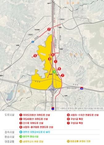 경기용인 플랫폼시티 주변 지역과의 접근성을 높이기 위해 사업지~용구대로와 사업지~수지 간 연결도로를 신설하고, 광역급행철도(GTX) 용인역 주변 교통량 증가를 고려해 기존 구성1교, 구성2교를 확장한다. 또한 경부선 지하고속도로 나들목(I.C)을 설치함에 따라 용인지역에서 경부고속도로 이용을 위해 성남, 수원 등 주변 지역으로 이동하는 주민 불편 해소도 기대된다. 향후 나들목(I.C) 설치 위치 및 형식 등 세부 사항은 경부선 지하고속도로 시행주체인 한국도로공사에서 검토할 예정이다.