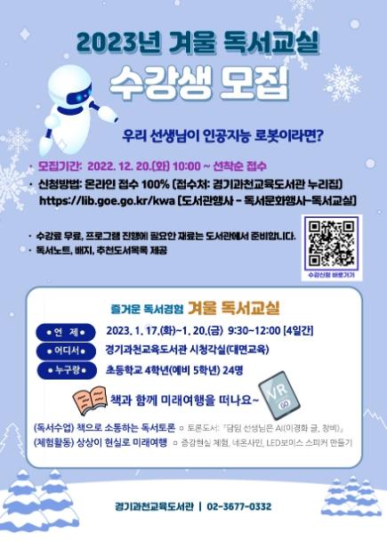 경기과천교육도서관(관장 윤재철)은 내년 1월 17일부터 20일까지 과천, 안양, 군포, 의왕지역 초등학교 4학년을 대상으로 겨울 독서교실을 운영한다.