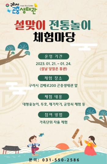 [한국뉴스타임=편집국] 구리시는 2023년 설 연휴 기간[1. 21 ~ 1. 24., 설날(22일)은 휴관]에 구리시곤충생태관에서‘설맞이 민속전통놀이 체험마당’을 운영할 계획이다.