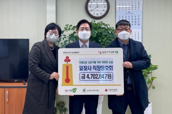 [한국뉴스타임=편집국] 남양주시는 18일 공무원 직장 동호회 얼찾사(얼을 찾는 사람들)에서 지역의 취약계층을 지원하기 위해 후원금 4,702,847원을 전달했다고 밝혔다.