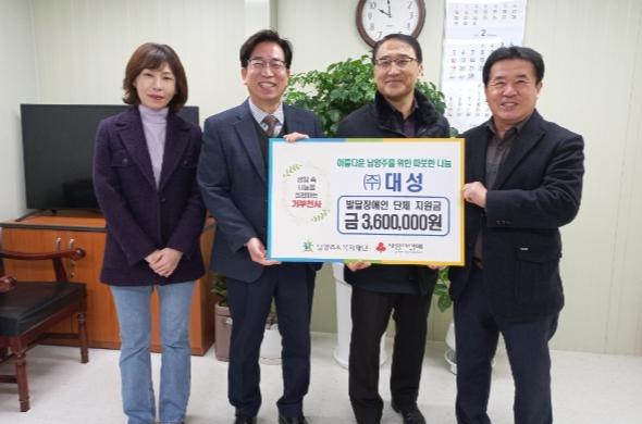 [한국뉴스타임=편집국] 남양주시는 8일 ㈜대성에서 지역 내 발달장애인의 자립 지원과 교육 활성화를 위해 후원금 360만 원을 전달했다고 밝혔다.