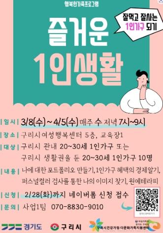 백경현 구리시장은 “이번 프로그램을 통해 구리시 내 증가하고 있는 1인가구와 노년기 가족이 사회적으로 고립되지 않고 안정적으로 정착할 수 있기를 기대한다. 앞으로도 구리시 내 다양한 가족의 욕구에 맞는 사업을 추진하겠다.”고 전했다.