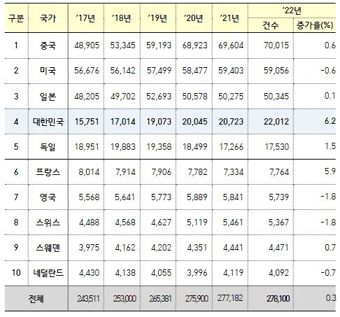 2022년 전 세계 국제특허출원(PCT)은 278,100건으로 전년 대비 0.3% 증가했고, 중국은 70,015건을 출원하여 4년 연속 세계 1위를 차지한 것으로 조사됐다.
