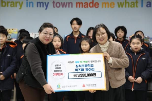 [한국뉴스타임=편집국] 남양주시는 심석초등학교 내 동아리 활동 모임인‘비즈쿨’이 지난 6일 후원금 333만3990원을 남양주시복지재단에 전달했다고 8일 밝혔다.