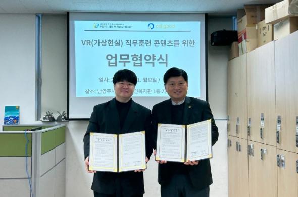 [한국뉴스타임=편집국] 남양주시북부장애인복지관과 ㈜페리굿은 지난 11일 4차 산업시대 가상현실(VR) 기술을 접목한 직무훈련 콘텐츠를 개발하기 위해 업무협약을 체결했다.