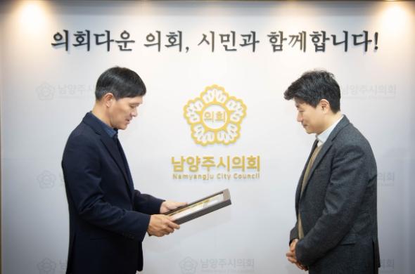 [한국뉴스타임=편집국] 남양주시의회는 지난 12월 12일 남양주시의회 의장실에서 경기시청자미디어센터 성경훈 센터장에게 의장 기관 표창을 수여했다.