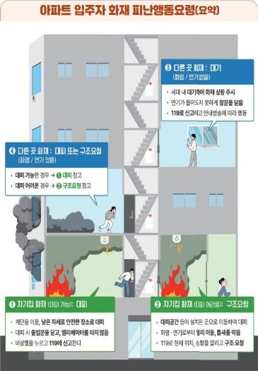 아파트는 다른 층으로 연소 확대되는 경우가 많지 않음으로 불구하고 대피하는 도중에 연기 질식으로 사망하는 경우가 많아, 실내에 연기가 들어오지 않을 때는 무조건적인 대피보다는 실내에 대기하면서 창문 등 연기 유입통로를 막고, 안내방송에 따라 행동하는 편이 더 안전하다.