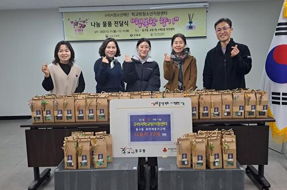 [한국뉴스타임=편집국] 구리시청소년재단 학교밖청소년지원센터는 지난 11일부터 12일까지 이틀간 관내 행정복지센터 3곳(동구동, 교문1동, 수택1동)을 방문해 청소년들이 직접 제작한 나눔 물품(디퓨저) 170개를 지역 내 홀몸 어르신들을 위해 전달했다.