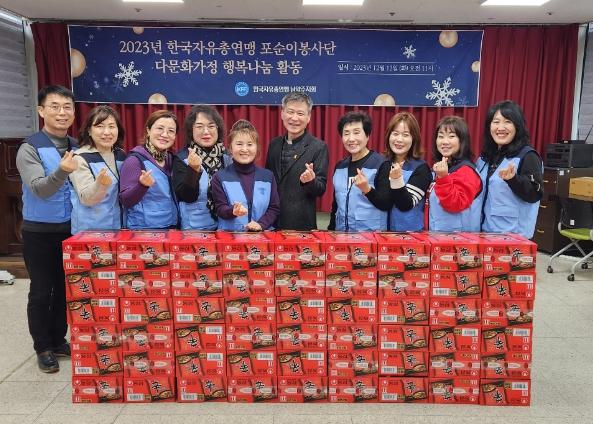 [한국뉴스타임=편집국] 한국자유총연맹 남양주시지회 포순이봉사단은 지난 12일 다문화가정을 위한 후원 물품(라면 54박스)을 남양주시외국인복지센터에 전달했다.