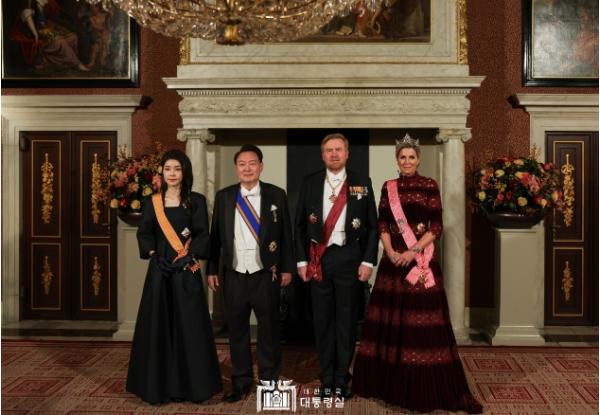 [한국뉴스타임=편집국] 네덜란드를 국빈 방문 중인 윤석열 대통령 부부는 오늘(12. 12, 화, 현지시간) 저녁 빌렘-알렉산더 국왕이 암스테르담 왕궁에서 주최한 국빈 만찬에 참석했다. 만찬에는 우리 공식수행원과 기업인, 양국의 각계 주요 인사 210여 명이 참석했다.