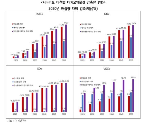 감축 시나리오별 장래 전망을 적용했을 경우 탄소중립 대책은 2050년에는 2020년 기준 온실가스 배출량의 약 73.6% 감소, 대기오염물질의 경우 많게는 약 73.2% 정도 감축이 예상됐다. 대기질 관리 대책의 이행으로도 온실가스와 대기오염물질 배출량 모두 감축이 가능하며, 그에 따른 온실가스 감축량은 2050년 39.6%로 분석됐다. 탄소중립 시나리오와 대기질 관리 시나리오를 동일하게 적용했을 때 공편익 효과가 가장 큰 분야는 무공해 차량 보급 정책으로 정책 간의 공편익 효과를 최대화할 수 있도록 상호 보완해 추진하는 것이 효과가 큰 것으로 나타났다.