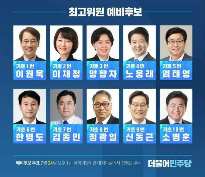 한편 최고위원직에 초선부터 4선까지 출마 선언이 잇따랐다. 소병훈 의원과 청와대 정무수석 출신인 한병도 의원, 김종민 의원 등이 출마를 선언했다. 앞서 노웅래, 이재정, 이원욱 의원, 염태영 수원시장 등이 출마를 선언했다. 최고위원 선출직은 5명이다. 출사표를 던진 사람은 10명이고, 이중 여성은 2명이다. 민주당은 최고위에 최소 1명 이상의 여성을 두도록 규정하고 있다.