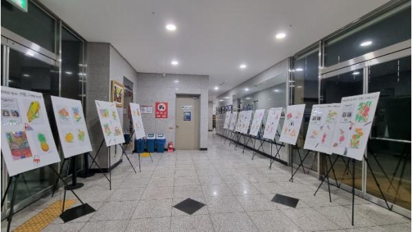 전시물은 6개월 동안 어르신들의 고독감을 해소하고 치매를 예방하기 위해 진행한 색칠 그림 활동의 작품들이며, 액자에 넣어 전시했다.