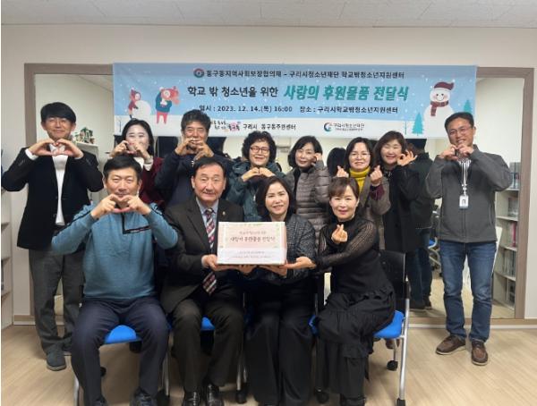 [한국뉴스타임=편집국] 구리시 동구동 행정복지센터(동장 김건영)는 지난 14일 동구동 지역사회보장협의체(민간위원장 변소현)가 구리시학교밖청소년지원센터에서 학교 밖 청소년을 위한 ‘사랑의 후원물품 전달식’을 개최했다고 밝혔다.