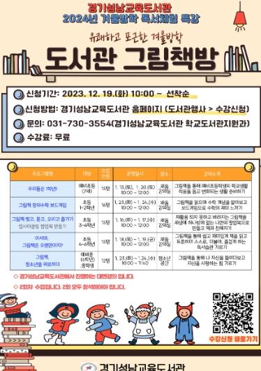[한국뉴스타임=편집국] 경기성남교육도서관이 겨울방학을 맞아 19일부터‘2024년 겨울방학 독서 체험 특강’교육생 80여 명을 선착순 모집한다.