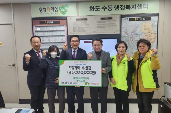 [한국뉴스타임=편집국] 남양주시 화도읍에 소재한 대한예수교장로회 마석교회는 지난 15일 소외된 이웃들을 위한 후원금 5,000,000원을 화도읍 지역사회보장협의체에 전달했다.