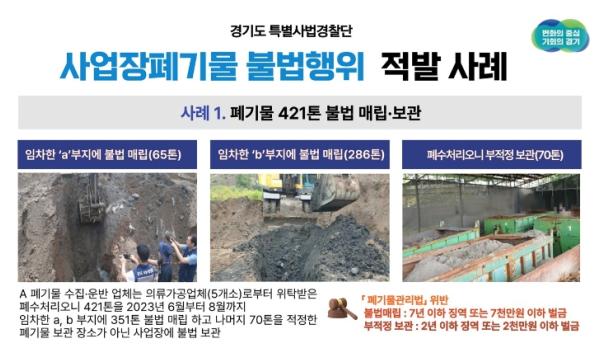 경기도 특별사법경찰단은 사업장폐기물에 대한 연중 수사 결과 118건을 적발해 95건은 검찰에 송치했고, 나머지 23건도 수사가 마무리되는 대로 송치할 예정이라고 19일 밝혔다.