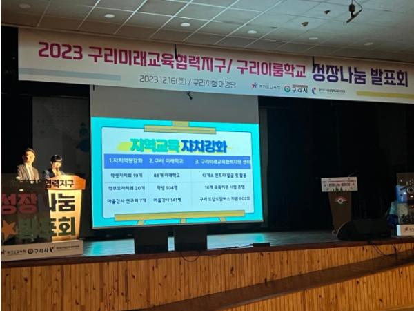 [한국뉴스타임=편집국] 경기도구리남양주교육지원청은 지난 12월 16일 구리시청 대강당에서 ‘2023 구리 미래교육협력지구 및 구리이룸학교 성장나눔 발표회’를 개최했다.