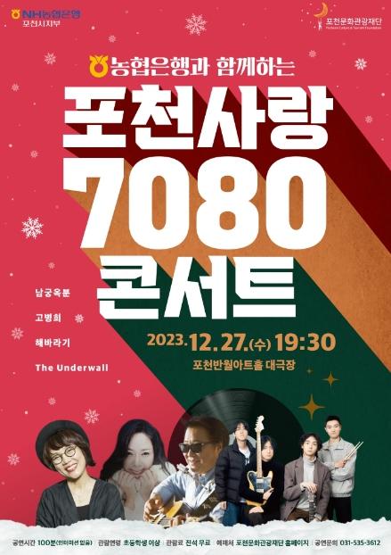 ‘포천사랑 7080 콘서트’는 포천반월아트홀에서 열리는 2023년 올해 마지막 공연으로, 추억의 가수 ▲남궁옥분 ▲해바라기 ▲고병희 ▲로큰롤 밴드 'The Underwall' 등 7080세대를 대표하는 가수들이 한자리에 모여 포크 음악을 중심으로 관객들에게 음악으로 추억을 선사할 예정이다.