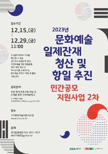 [한국뉴스타임=편집국] 경기도와 경기문화재단(대표이사 유인택)은 항일·독립운동에 관한 문화와 예술 콘텐츠 제작을 지원하는 '문화예술 일제잔재 청산 및 항일 추진 민간공모 지원사업 2차'를 시행한다.