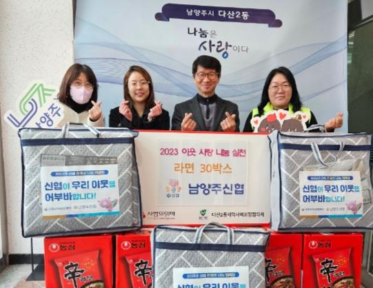[한국뉴스타임=편집국] 남양주신협은 성탄절을 앞두고 지난 19일 다산2동 지역사회보장협의체에 라면 30박스와 이불 3채를 기탁했다.
