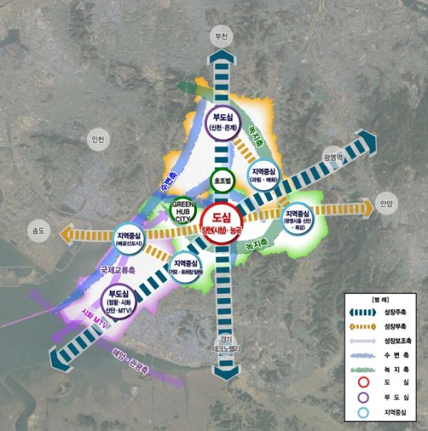 공간구조는 시흥시의 시가지 면적과 교통축 변화추이, 성장 잠재력 등을 고려해 1도심 3부도심 1지역 중심에서 1도심 2부도심 4지역중심으로 설정했다.