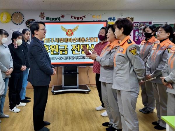 [한국뉴스타임=편집국] 남양주시평내여성의용소방대는 지난 19일 남양주시장애인복지관 성인주간보호센터에 ‘연말 사랑 나눔 후원금’을 전달했다.