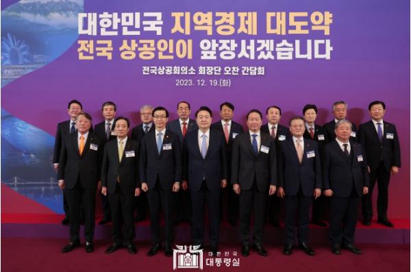 [한국뉴스타임=편집국] 윤석열 대통령은 12월 19일 각 지역을 대표하는 전국상공회의소 회장단을 청와대 영빈관으로 초청해 오찬 간담회를 열었다. 오늘 오찬 간담회는 각 지역을 대표하는 상공인들과 격의 없이 소통하고 경제 활력 제고를 위한 민·관 ‘팀 코리아’ 협력을 강화하기 위해 마련됐다.