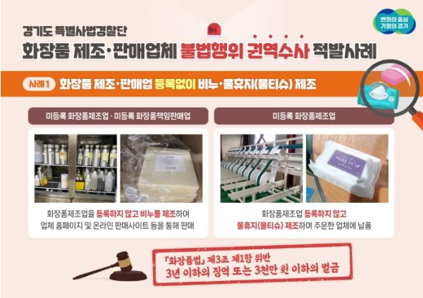 고양시 B업체도 식품의약품안전처에 화장품제조업을 등록하지 않고 화장품에 속하는 물휴지(물티슈)를 제조하다 단속에 적발됐다.